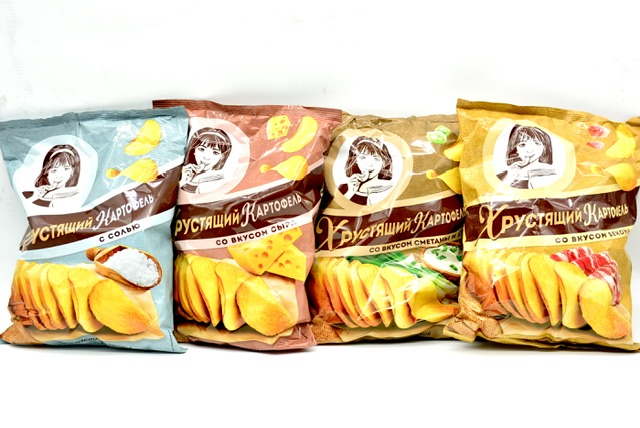 Чипсы "Хрустящий картофель" (Девочка) в ломтиках со вкусами: соль, сметана-лук, сыр.